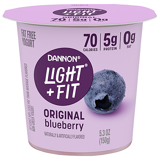 Looking for a delicious fat free yogurt with creamy blueberry flavor? Give your taste buds a reason to rejoice with a Dannon Light + Fit Blueberry Original Nonfat Yogurt Cup. Every bite of this blueberry flavored yogurt makes it easy to love fat free snacks with this delicious light yogurt brand.* At Light + Fit, we serve balanced packed full of delightfully creamy yogurt so you can be your best self. Our fat free yogurt comes in a cup so you can enjoy a serving anytime as a snack at work or as a late-night snack. With 70 calories and 5g of protein per serving, it’s a delicious, convenient option. Enjoy it as a simple snack or add a cup to your breakfast parfaits and yogurt smoothies. Or, use some in your favorite recipes as a flavorful substitute for baking ingredients. Add some joy to your day, every day, with Light + Fit Blueberry Original Nonfat Yogurt. *At least 50% less fat than average flavored non-Greek yogurt; Light + Fit: 50-60 calories, 0g fat; Average flavored non-Greek yogurt: 100 calories, 2g fat per 4 oz. At Light + Fit, we believe that healthy living feels lighter when defined by what’s right for you. We commit to opening the door to a world of health where you are free to be who you are. With our wide selection of yogurts and protein smoothies, we make it easier to define healthy living with joyfully, fulfilling foods and experiences that are in tune with your unique body needs. Light + Fit nonfat yogurt and nonfat yogurt drinks are not only delicious, but also fit nicely into your wellness routine. Add Some Light to your day with Light + Fit!